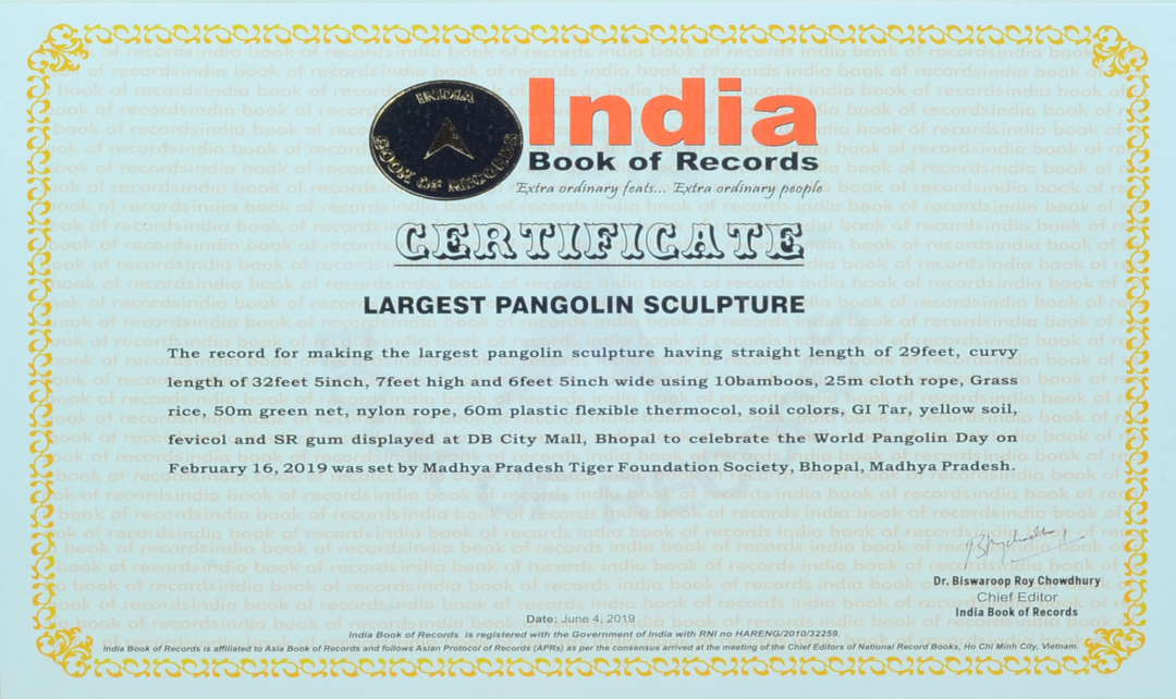 The efforts of MPTFS of celebrating World Pangolin Day by creating awareness about Pangolin through the gigantic sculpture also helped in setting the record for making the "Largest Pangolin Sculpture" which was certified by India Book of Records on 4" June 2019.
